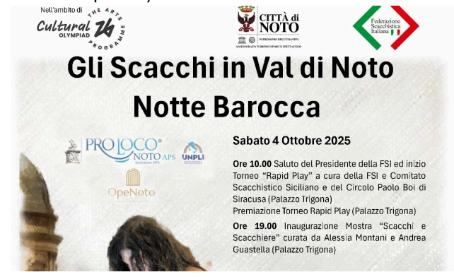 La città di Noto, gioiello del Barocco siciliano e patrimonio mondiale UNESCO, si prepara ad accogliere la quarta edizione di “Gli Scacchi in Val di Noto”, in programma sabato 4 e domenica 5 ottobre 2025.